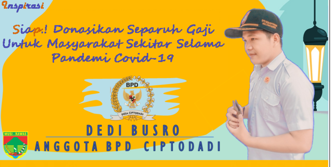 MUSI RAWAS, Mattanews.co – Anggota BPD Ciptodadi Kecamatan Sukakarya Kab.Musi Rawas, Dedi Busro, Terketuk hatinya untuk menyumbangkan separuh gajinya selama pandemi Covid-19 ini berlangsung kepada masyarakat yang telah memberikan kepercayaan dirinya sebagai Parlemen Desa.