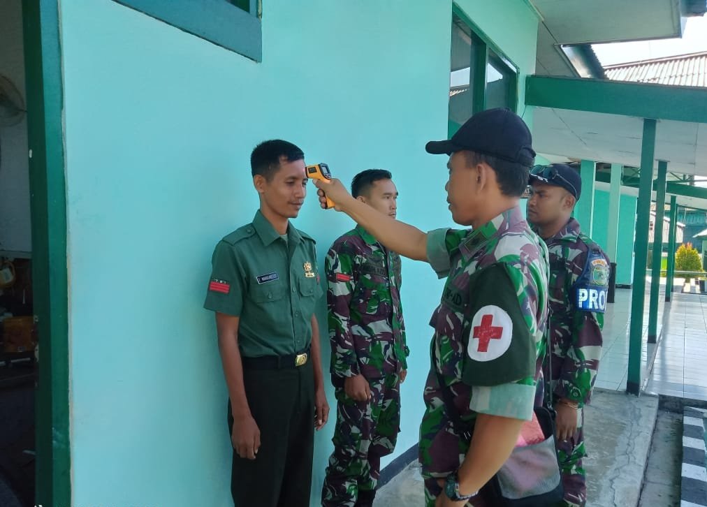 Jajaran Kodim 1803 Fakfak dengan melakukan pengukuran suhu tubuh dengan menggunakan alat body infrared gun ke seluruh prajurit ,Rabu/18/maret/2020.