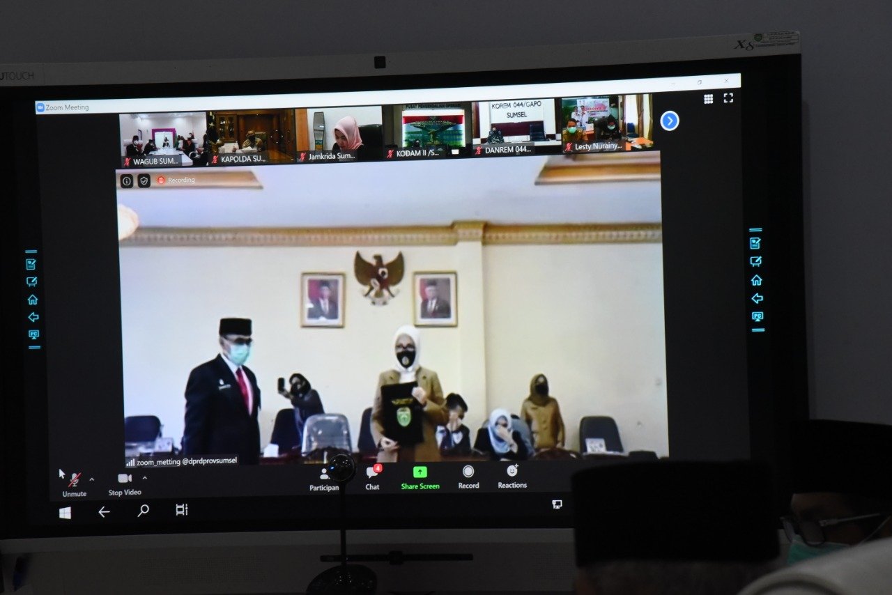 PALEMBANG, Mattanews.co – Gubernur Sumsel H.Herman Deru diwakili Wakil Gubernur Sumsel H.Mawardi Yahya menghadiri Rapat Paripurna XIII (13) DPRD Provinsi Sumsel via video conference dengan agenda Penyampaian Rekomendasi DPRD Provinsi Sumsel kepada Gubernur Sumsel terhadap LKPJ Gubernur Sumsel TA 2019, dari Command Centre, Senin (18/5) pagi. Rapat tersebut dipimpin langsung Ketua DPRD Provinsi Sumsel R.A Anita Noeringhati.