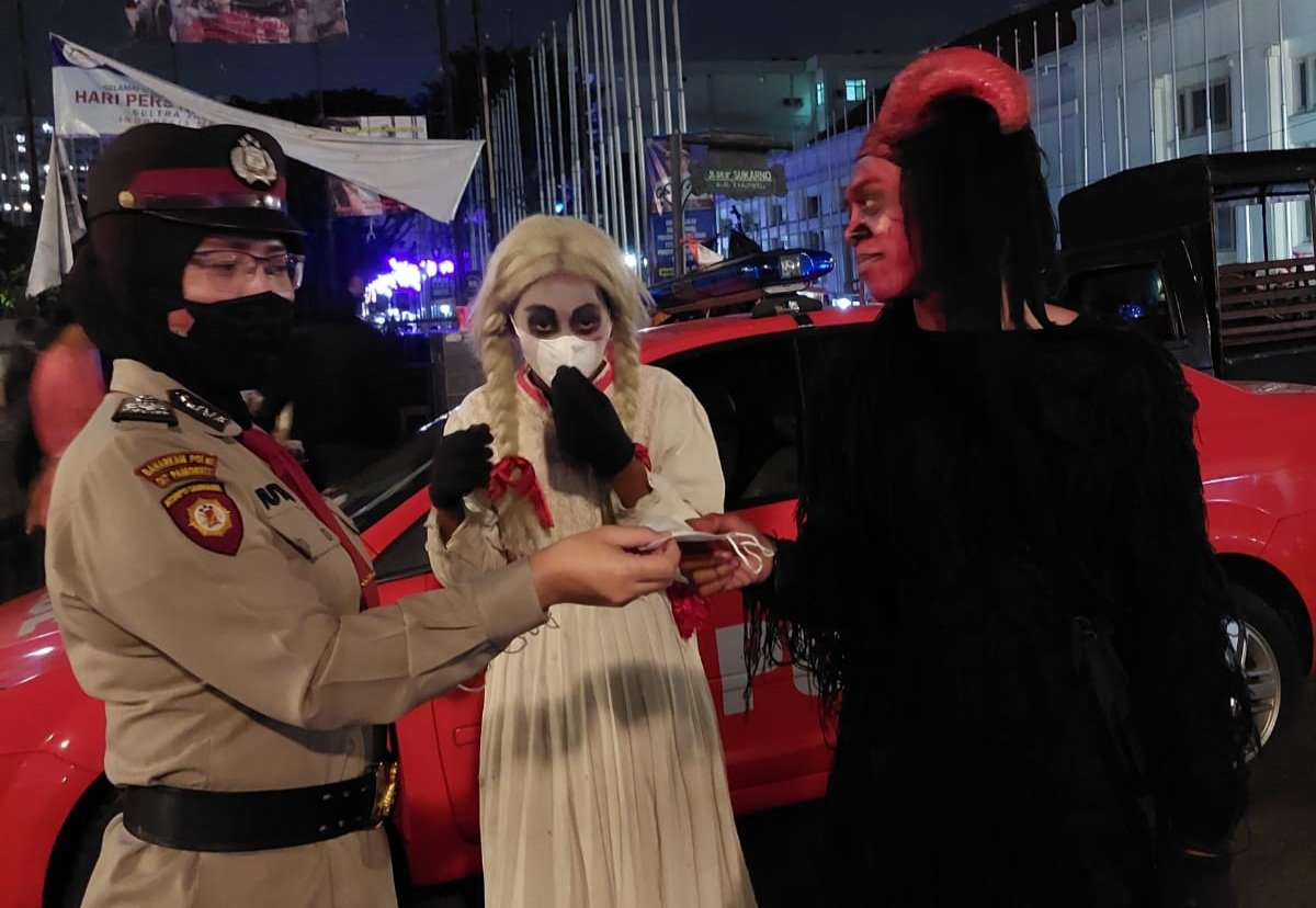 Disana terlihat, petugas kepolisian membagikan masker kepada pengunjung. Bahkan, Cosplay ‘Hantu’ pun turut diberikan masker oleh petugas disana.