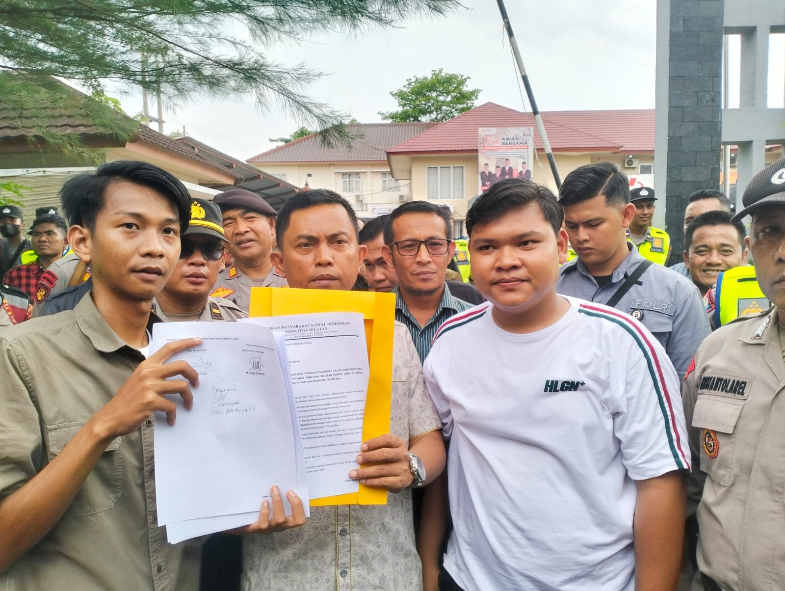 MATTANEWS.CO, PALEMBANG –Gerakan Masyarakat Kawal Demokrasi Sumatera Selatan, gelar aksi damai, di depan Gedung Bawaslu Provinsi Sumsel, Jalan Gubernur HA Bastari, Komplek OPI, Jakabaring Palembang, Sumsel, Kamis (5/12/2024).