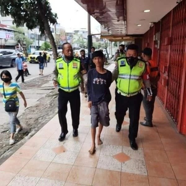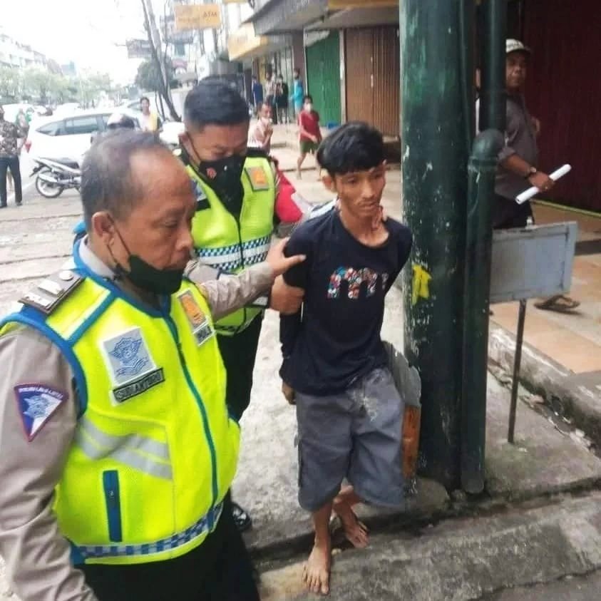 Pelaku diamankan anggota Satlantss Polrestabes Palembang, Iptu Sugiantoro, Bripka Sardiansyah dan Bripka Moh Zamzami Purnama Yudha, saat melaksanakan giat rutin pagi mengatur lalu lintas Jalan Jendral Sudirman depan Mall IP, Palembang.