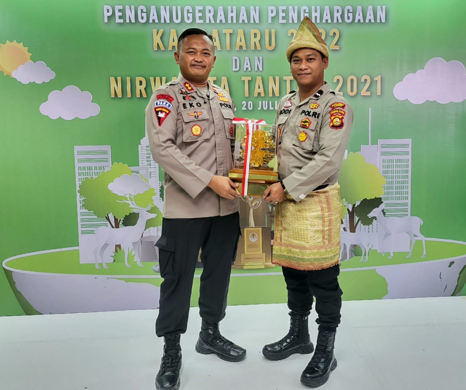 MATTANEWS.CO, JAKARTA PUSAT–  Kapolres Lahat AKBP Eko Sumaryanto SIK, mendampingi Aipda Dodi Permana SH.MM, naik ke panggung untuk menerima piagam penghargaan Kalpataru tahun 2022 dari menteri Lingkungan Hidup dan Kehutanan kategori Pengabdi lingkungan dengan no Sk.533/MEN LHK/PSKL/PSI.315/2022 oleh Ibu Dr.Ir Siti Nurbaya Bakar M.Sc. dalam acara penyerahan di Auditorium Gedung Manggala Wanabakti, Jakarta pusat, Rabu (20/7/2022).