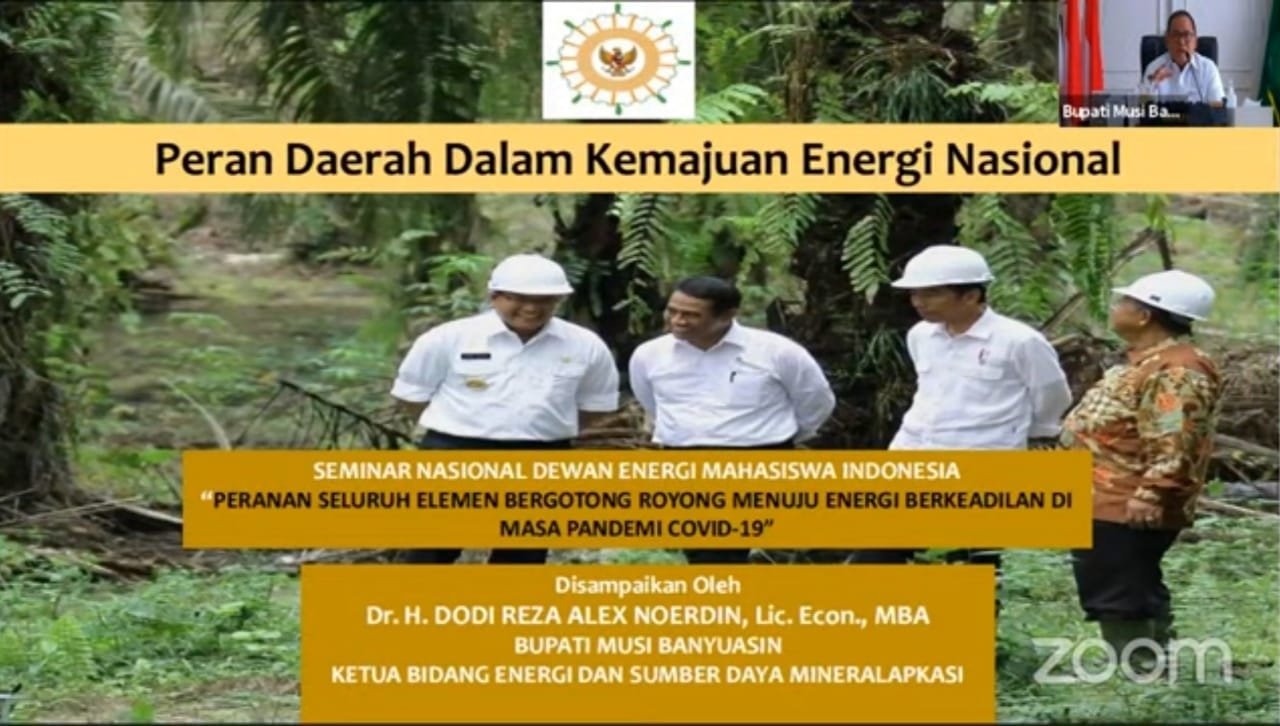 Kali ini Bupati Dr H Dodi Reza Alex Noerdin Lic Econ MBA sebagai Ketua Bidang Energi Dan Sumber Daya Mineral (SDM) Asosiasi Pemerintah Kabupaten Seluruh Indonesia (APKASI), didapuk narasumber Seminar Nasional dengan tema “Peranan Seluruh Elemen Bergotong Royong Menuju Energi Berkeadilan di Masa Pandemi COVID-19” yang dilaksanakan secara virtual,