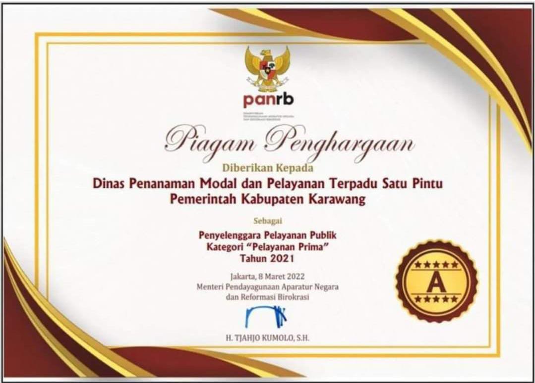 MATTANEWS.CO, KARAWANG – Dinas Penanaman Modal dan Pelayanan Terpadu Satu Pintu (DPMPTSP) Kabupaten Karawang mendapatkan penghargaan pada Penyelenggara Pelayanan Publik Kategori ‘Pelayanan Prima’ dari Kementerian Pendayagunaan Aparatur Negera dan Reformasi Birokrasi (KemenPan-RB).
