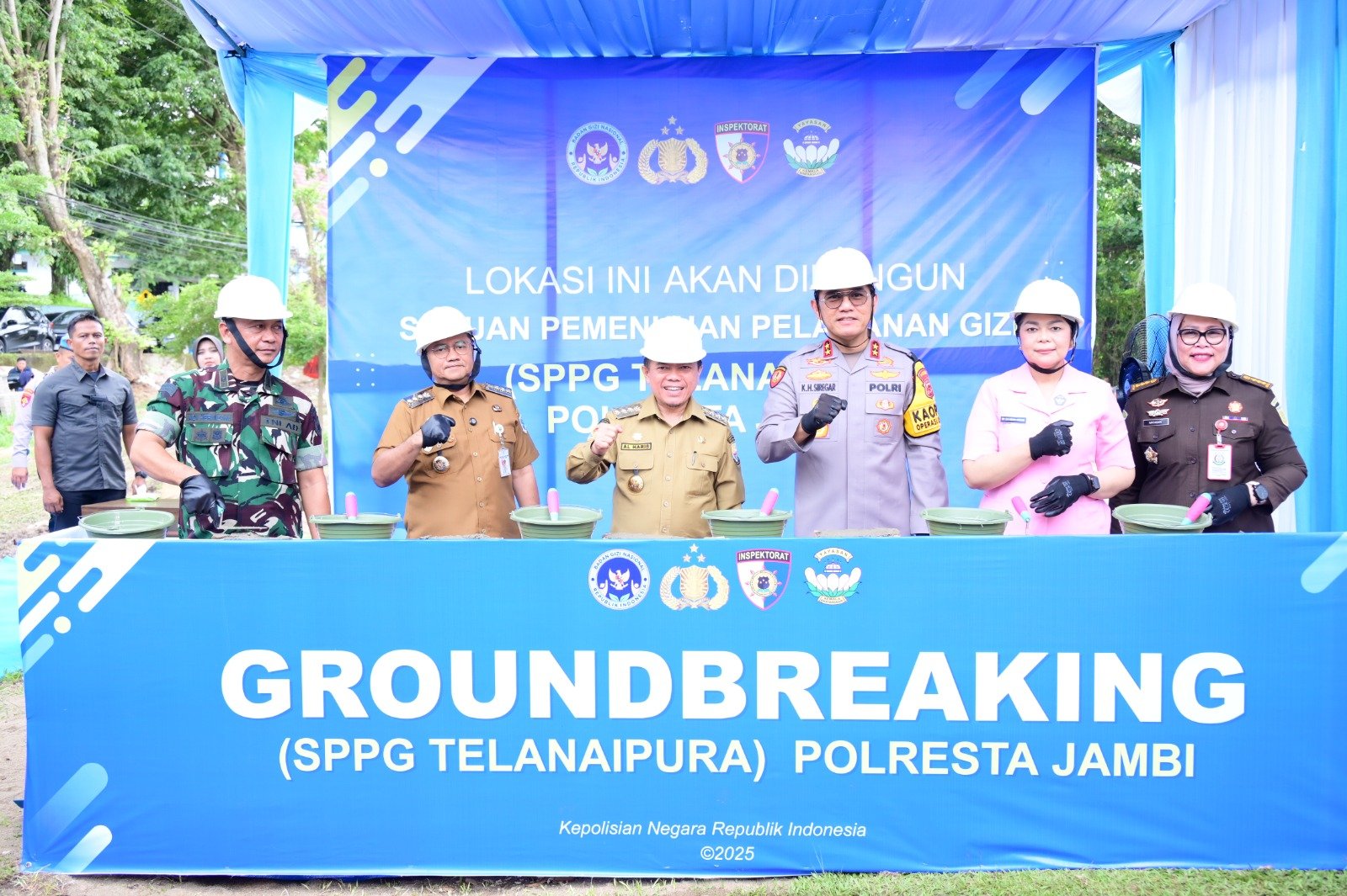 MATTANEWS.CO, JAMBI – Kepolisian Daerah (Polda) Jambi melaksanakan kegiatan ground breaking Satuan Pelayanan Pemenuhan Gizi (SPPG) secara serentak dan daring, yang dipusatkan di SPPG Polsek Telanaipura, Polresta Jambi, Senin (29/12/2025).