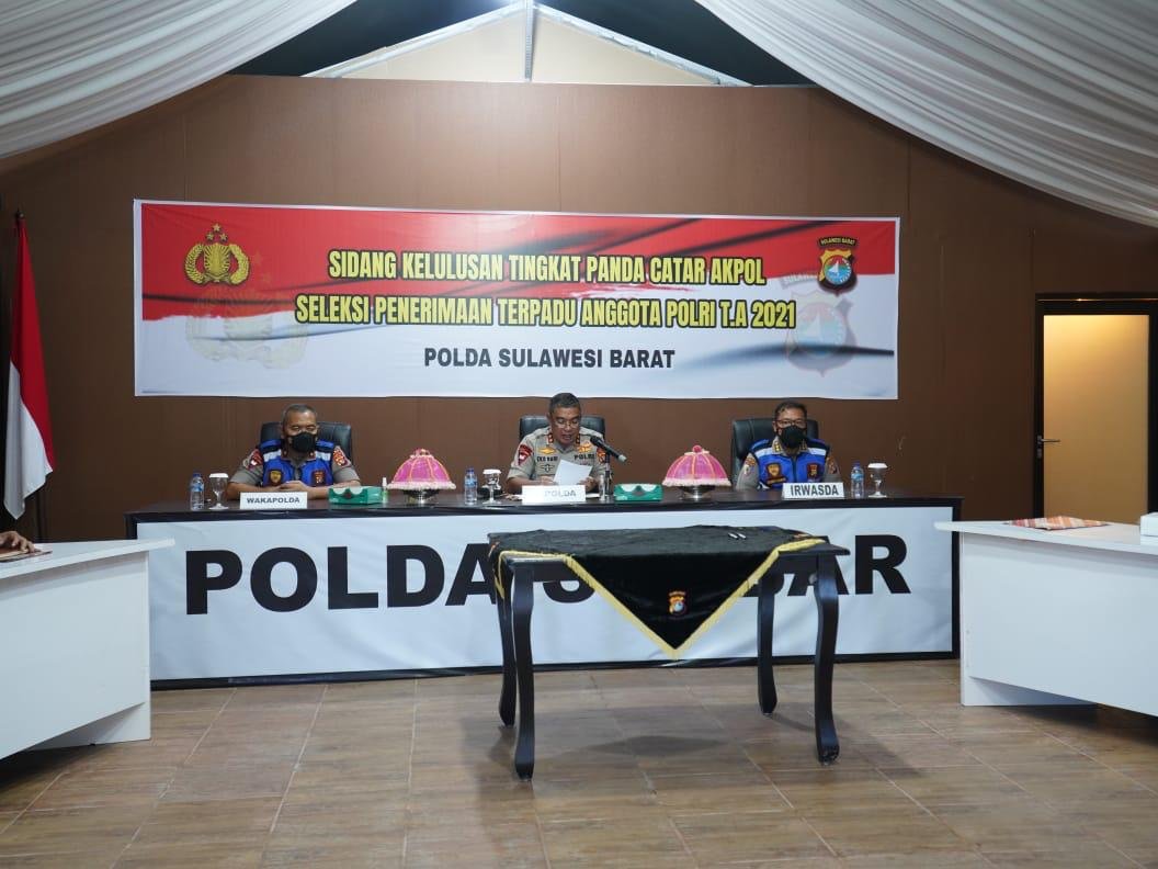 Sidang kelulusan yang dilaksanakan di ruang Vicon tenda lapangan Polda Sulbar tersebut dipimpin langsung oleh Kapolda Sulbar Irjen Pol Eko Budi Sampurno dan dihadiri oleh Para pejabat Utama, Pengawas Eksternal dan 7 orang peserta seleksi yang didampingi orang tua masing-masing, kamis (24/66/2021).