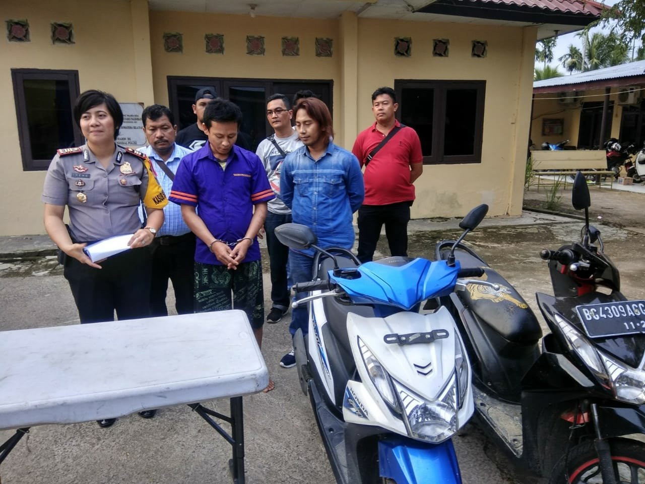 Dengan barang bukti berupa dua unit sepeda motor, sebilah senjata tajam jenis pisau, kunci retel T baju yang digunakan ketika beraksi, tersangka yang digerbek di rumahnya, Jalan Taqwa, Mata Merah, Kecamatan Kalidoni langsung digelandang ke Polsek untuk menjalani pemeriksaan lebih lanjut.