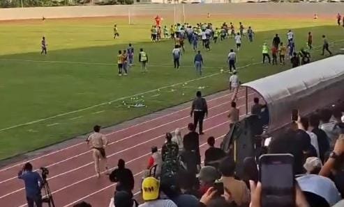Wasit akhirnya menghentikan pertandingan sementara. Panitia pelaksana bersama perangkat pertandingan dan aparat keamanan langsung turun tangan untuk mengamankan keadaan.