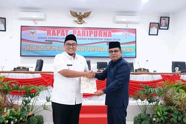 MATTANEWS.CO, TANAH DATAR – Dewan Perwakilan Rakyat Daerah (DPRD) Kabupaten Tanah Datar menggelar Rapat Paripurna pandangan umum fraksi terhadap Nota Penjelasan Bupati Tanah Datar terhadap Rancangan Peraturan Daerah (Raperda) Anggaran Pendapatan Belanja Daerah (APBD) Tahun Anggaran (TA) 2024. Rapat Paripurna tersebut digelar di Ruang Sidang Utama DPRD setempat, Rabu (8/11/23).