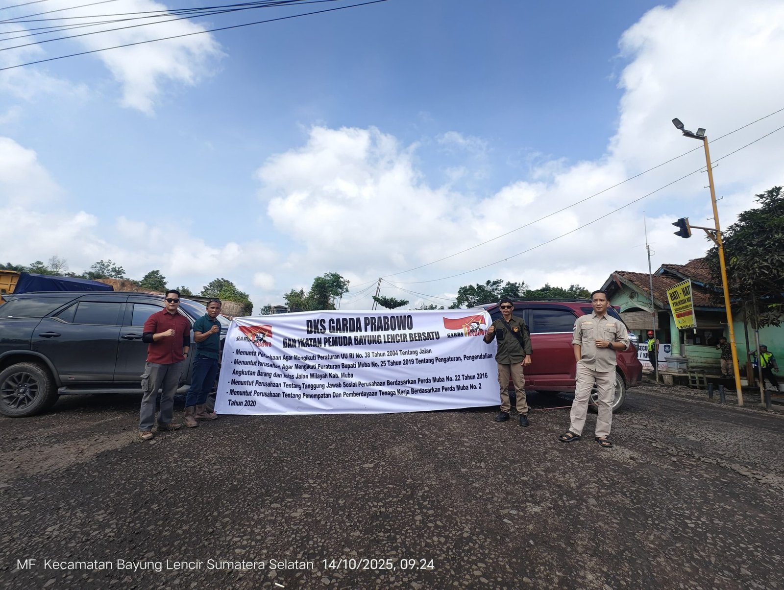 MATTANEWS.CO, MUSI BANYUASIN – DKS Garda Prabowo bersama Ikatan Pemuda Bayung Lencir Bersatu (IPBLB) menggelar aksi damai di simpang B80, Desa Sindang Marga, Kecamatan Bayung Lencir, Kabupaten Musi Banyuasin, Senin (14/10/2025). Titik tersebut menjadi jalur utama lalu lintas angkutan batu bara menuju pelabuhan dari kawasan tambang.