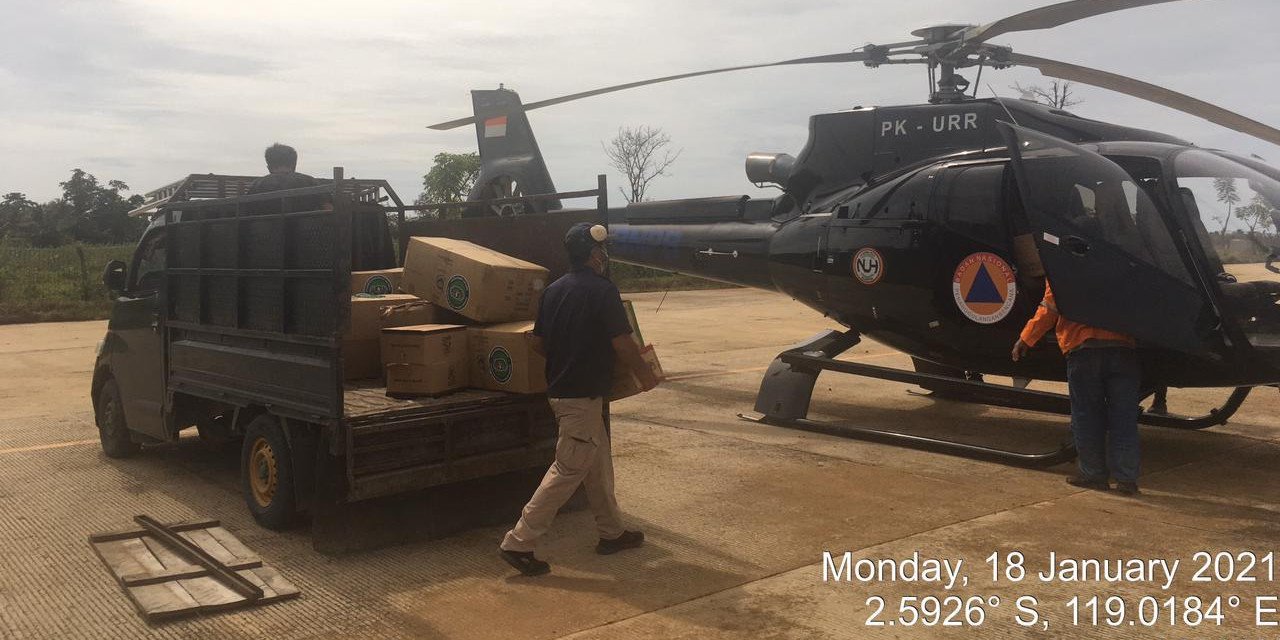 Selain itu, pendistribusian bantuan logistik juga telah dilakukan berupa 270 dus mie instan, 15 dus air mineral dan 5 bal selimut melalui perjalanan udara menggunakan helikopter ke Kabupaten Mamuju dan Kabupaten Majene pada Minggu (17/1/2021).