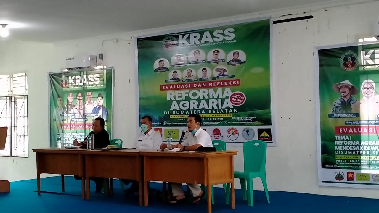 MATTANEWS.CO, PALEMBANG – Komite Reforma Agraria Sumatera Selatan (KRASS) menggelar Refleksi dan Evaluasi Regorma Agraria, bersama Ketua Gugus Tugas Reforma Agraria (GTRA), Gubernur Sumsel Herman Deru (HD), Ketua DPRD Sumsel RA Anita Norenghati, dan Penggiat Nasional KPA.