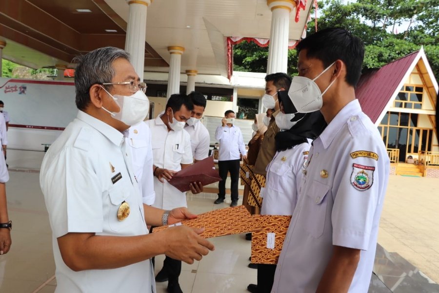 MATTANEWS.CO, SULBAR – Gubernur Sulawesi Barat (Sulbar), Ali Baal Masdar menyerahkan Surat Keputusan (SK) Calon Pegawai Negeri Sipil (CPNS) dan Pegawai Pemerintah dengan Perjanjian Kerja (PPPK) Guru Tahap I lingkup Pemprov Sulbar Formasi Tahun 2021, di Tribun Kantor Merah Putih Gubernur Sulbar, Rabu (30/3/ 2022).