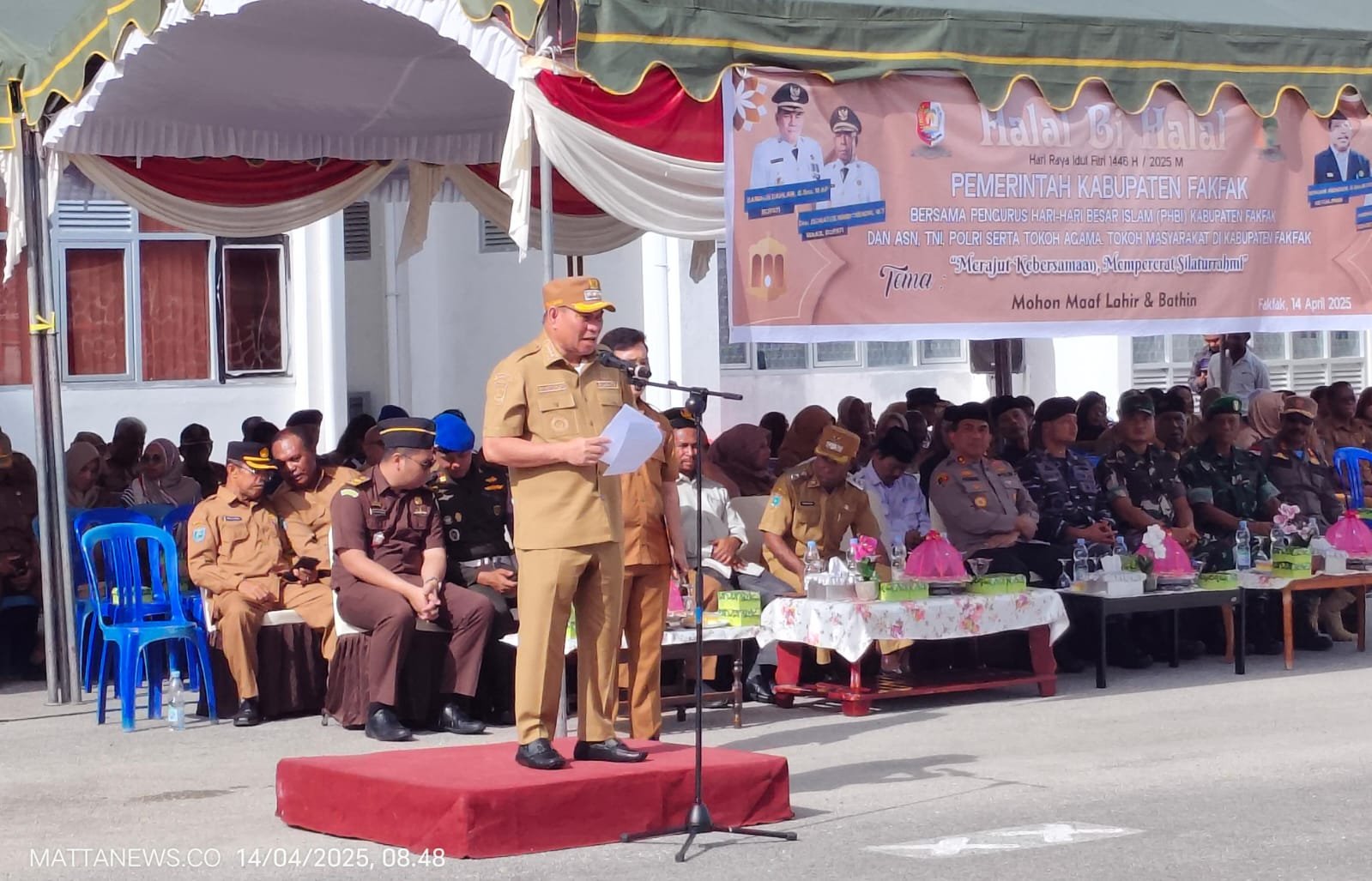 MATTANEWS.CO, FAKFAK – Pemerintah Kabupaten Fakfak menggelar halal bihalal Idul Fitri bersama Pengurus Hari Hari Besar Islam (PHBI), ASN, TN/Polri, Tokoh agama dan Tokoh masyarakat di Kabupaten Fakfak, dengan mengusung tema, ‘Merajut kebersamaan, mempererat silaturahmi’, di halaman Kantor Pemda Fakfak, Senin (14/5/2025).