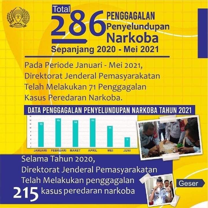 Terbukti sepanjang tahun 2020 hingga 2021, hampir 300 upaya penyelundupan barang haram tersebut ke dalam Lembaga Pemasyarakatan (Lapas) dan Rumah Tahanan Negara (Rutan) berhasil digagalkan oleh petugas.