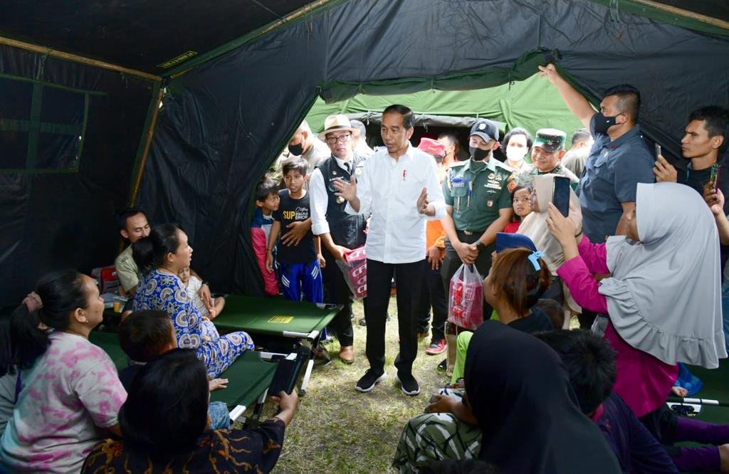 MATTANEWS.CO, JAKARTA– Presiden Joko Widodo meninjau langsung lokasi terdampak gempa bumi, di Kabupaten Cianjur, Provinsi Jawa Barat, pada Selasa, 22 November 2022. Dalam kesempatan tersebut, Presiden mengunjungi tenda pengungsian di Taman Prawatasari yang menjadi tempat tinggal sementara para warga yang terdampak gempa bumi.