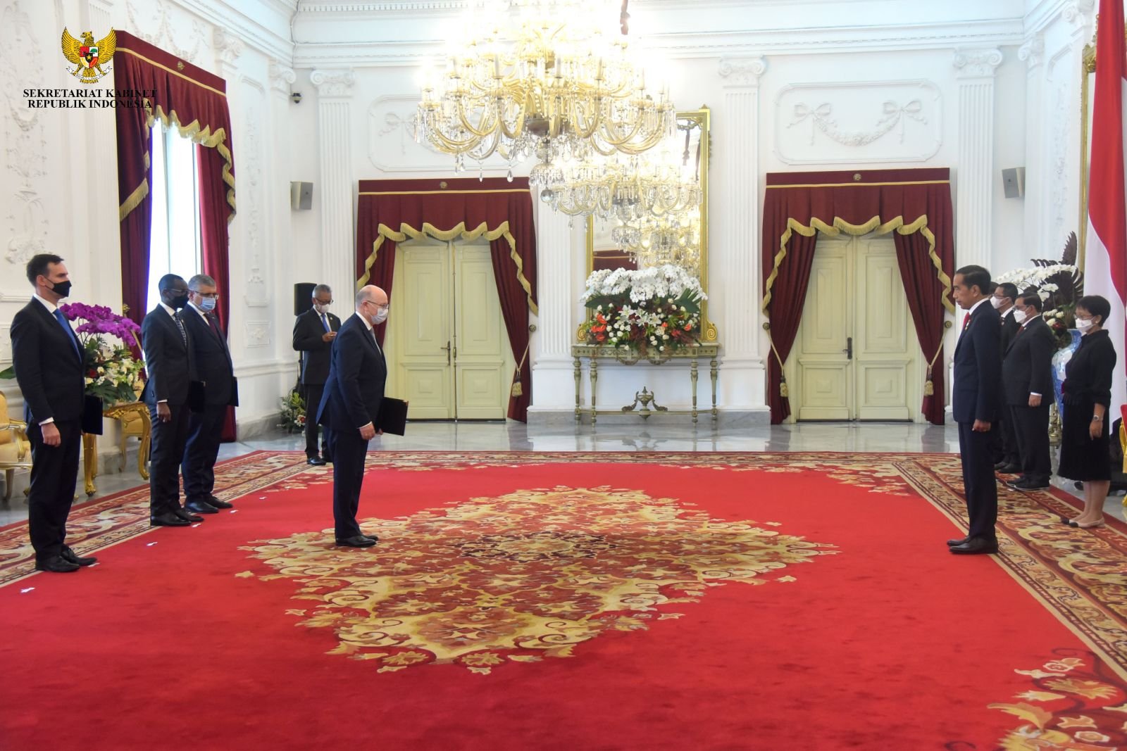 Turut hadir dalam kesempatan tersebut yaitu Menteri Luar Negeri Retno Marsudi, Sekretaris Kabinet Pramono Anung, Kepala Sekretariat Presiden Heru Budi Hartono, Sekretaris Militer Presiden Laksma TNI Hersan, serta Direktur Jenderal Protokol dan Konsuler Kementerian Luar Negeri atau Kepala Protokol Negara, Andy Rachmianto.