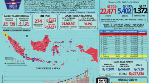 JAKARTA, Mattanews.co– Pemerintah Indonesia melalui Gugus Tugas Percepatan Penanganan COVID-19 mencatat jumlah penambahan pasien sembuh COVID-19 per hari ini Minggu (24/5/2020) bertepatan dengan Hari Raya Idul Fitri, ada sebanyak 153 orang sehingga totalnya menjadi 5.402. Sedangkan terkonfirmasi positif menjadi 22.271 setelah ada penambahan 526 orang dan kasus meninggal menjadi 1.372 dengan penambahan 21 orang.