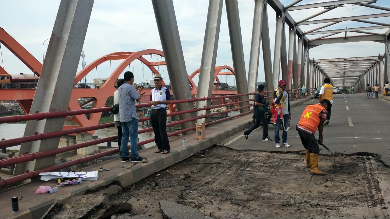 Mengenakan baju kaos berkerah oblong motif garis harizontal sepadan dengan celana dasarnya, orang nomor satu di Kota Palembang ini, terlihat dengan cermat memperhatikan bagian kerusakan jembatan yang dibangun 1994 silam.