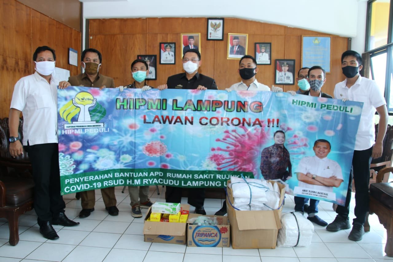 Bantuan disampaikan oleh Ketua BPC HIPMI Lampung Utara Isa Rahmat Martadinata, S.E. yang didampingi dengan segenap Pengurus BPC HIPMI Lampung Utara dan diterima langsung oleh Plt. Direktur RSD H.M. Ryacudu dr. Syah Indra, SPOG yang didampingi Ketua Sekretariat Posko Terpadu Gugus Covid-19 Sanny Lumi, S.STP., M.Si. dan perwakilan dari PMI di Posko Terpadu Covid-19 di Gedung Korpri Kotabumi, Rabu (22/04/2020).