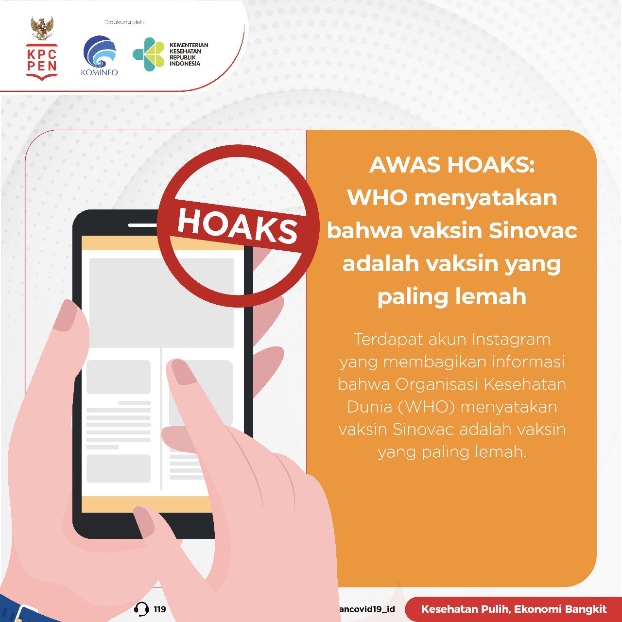 MATTANEWS.CO, JAKARTA– Terdapat akun Instagram yang membagikan informasi bahwa Organisasi Kesehatan Dunia (WHO) menyatakan vaksin Sinovac adalah vaksin yang paling lemah.