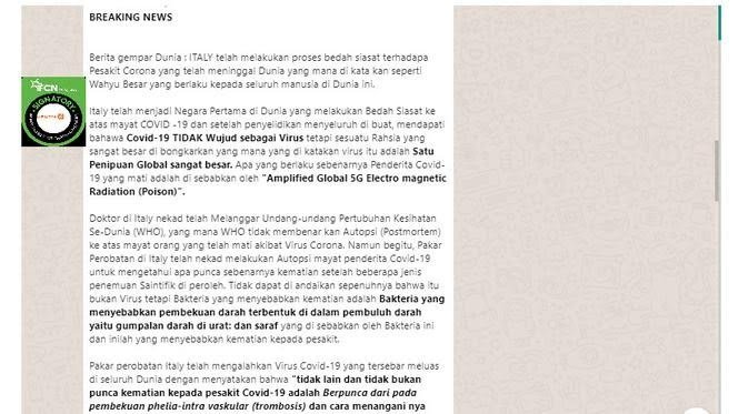 MATTANEWS.CO, JAKARTA– Beredar pesan berantai di aplikasi percakapan Whatsapp Messenger yang menyebut Dokter Italia menemukan penyebab Covid-19 dari bakteri terpapar 5G dan bisa sembuh dengan antibiotik. Pesan berantai ini ramai dibagikan sejak beberapa waktu lalu.