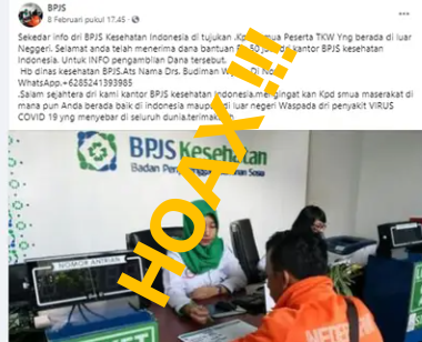 “Semua informasi tentang BPJS Kesehatan bisa dilihat melalui situs www.bpjs-kesehatan.go.id. Adapun akun media sosial resmi milik BPJS Kesehatan adalah @BPJSKesehatanRI untuk di Facebook dan @bpjskesehatan_ri di Instagram. Ia juga memastikan BPJS Kesehatan tidak memberikan bantuan finansial dalam bentuk apapun dan menyebut informasi tersebut hoaks. Terkait informasi adanya bantuan dari BPJS ini, Badan Penyelenggara Jaminan Sosial (BPJS) Kesehatan Kantor Cabang Kediri, Jawa Timur, juga pernah mengimbau warga untuk mewaspadai penipuan yang menggunakan nama BPJS Kesehatan dengan modus pemberian bantuan dana dari BPJS pusat,” dilansir kominfo.go.id, Jumat (26/2/2021).