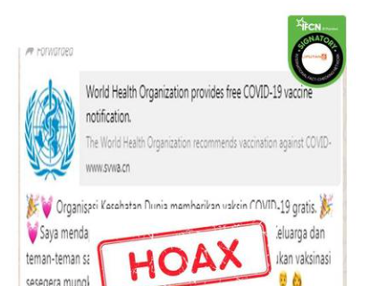 Faktanya, Klaim Pesan berantai berisi link pendaftaran untuk vaksin covid-19 gratis dari WHO adalah hoaks.