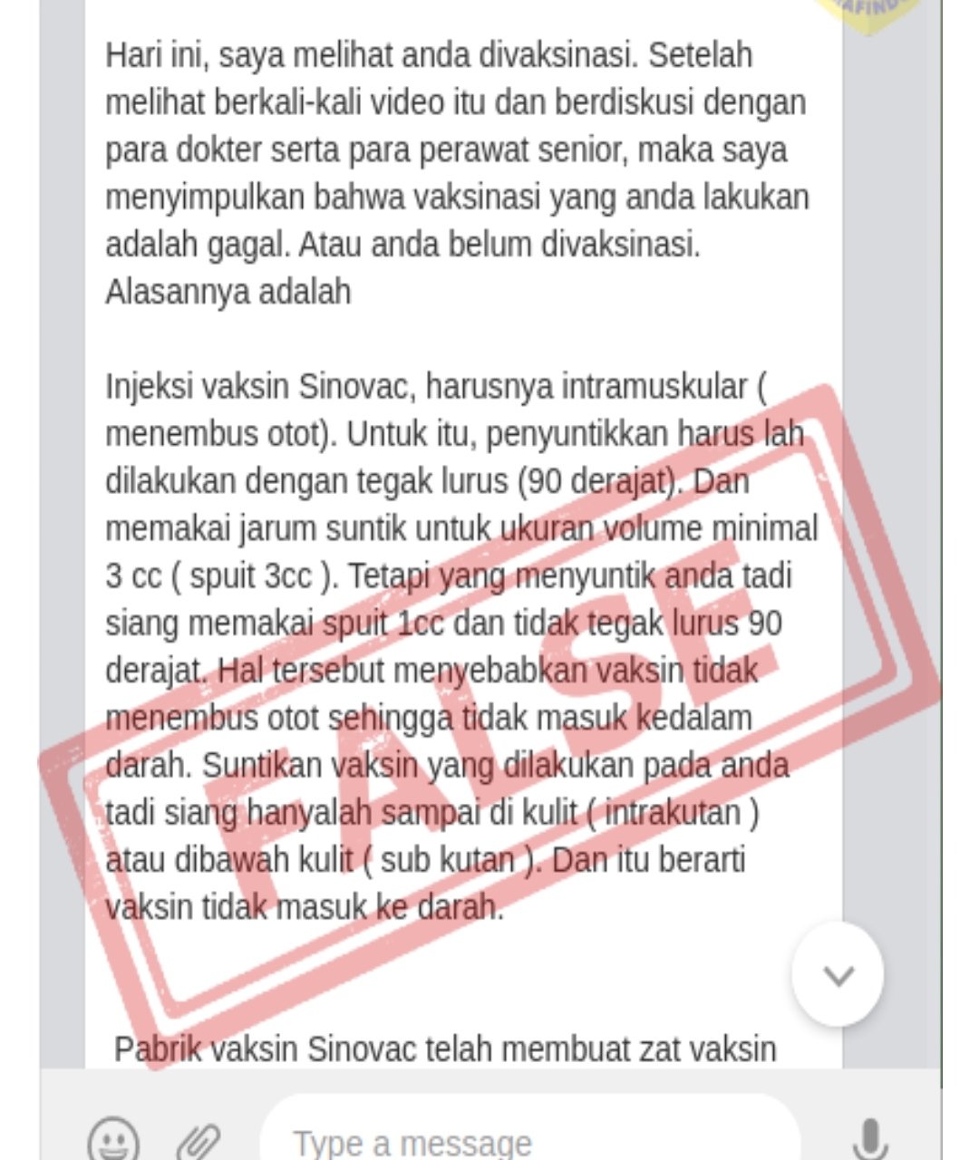 MATTANEWS.CO, JAKARTA– Beredar pesan berantai Whatsapp dan media sosial memuat surat terbuka yang menyatakan vaksinasi covid-19 untuk presiden Joko Widodo gagal dan harus diulang. Pada pesan yang beredar, disebutkan suntikan vaksin seharusnya menembus otot dan dilakukan dengan tegak lurus 90 derajat