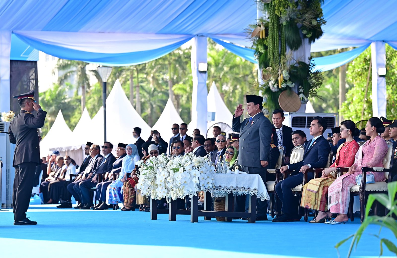 Turut hadir dalam acara tersebut adalah Wakil Presiden Gibran Rakabuming, Presiden ke-6 RI Susilo Bambang Yudhoyono, Wakil Presiden ke-6 RI Try Sutrisno, Wakil Presiden ke-10 dan ke-12 RI Jusuf Kalla, Wakil Presiden ke-13 RI Ma’ruf Amin, para duta besar negara sahabat, para pimpinan lembaga negara, serta para menteri kabinet Merah-Putih.
