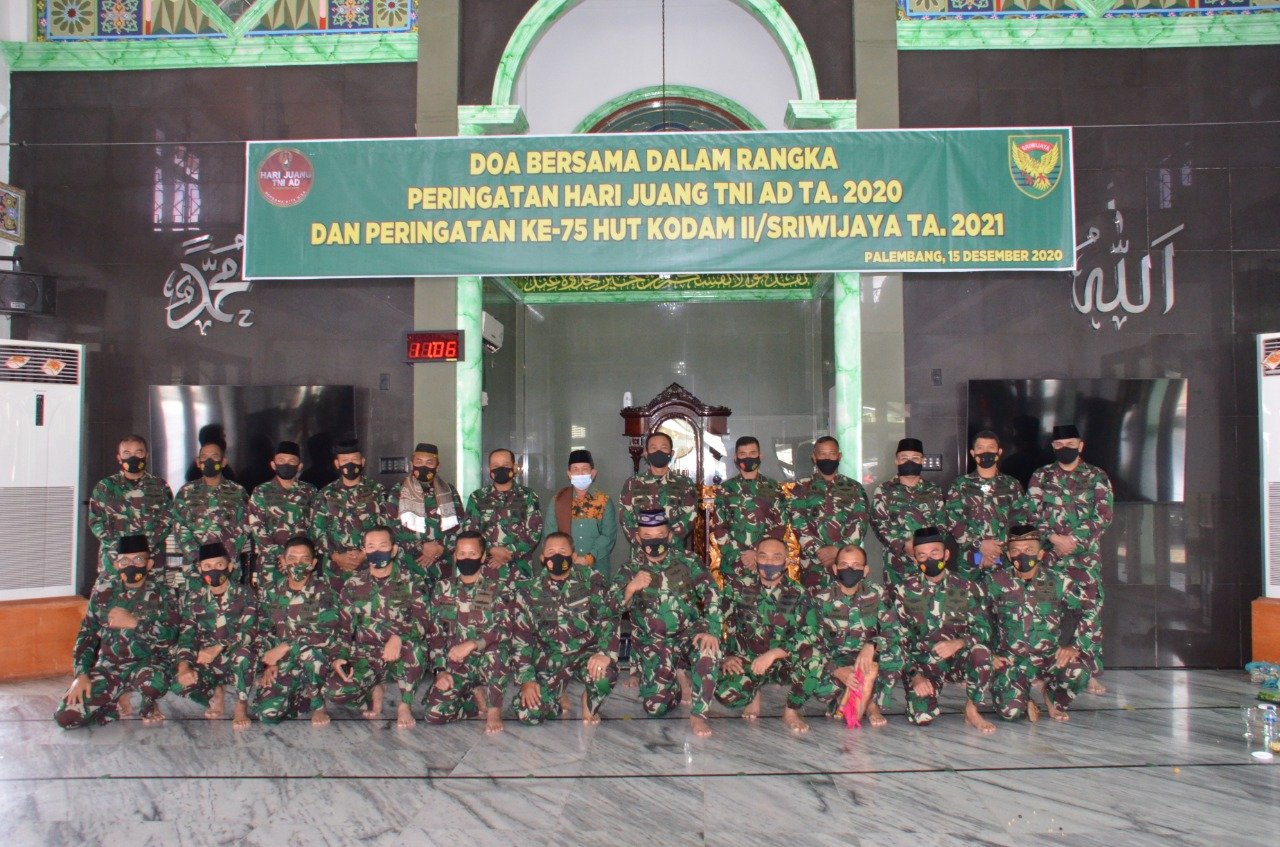 PALEMBANG, Mattanews.co – Peringatan Hari Juang TNI AD tahun 2020 dan Peringatan Ke-75 HUT Kodam II/Swj, jajaran TNI mengelar doa bersama di Masjid Radhatul Ulum Makodam ll/Swj. Nampak, Pangdam II/Swj, Mayjen TNI Agus Suhardi dan Komandan Korem 044/Gapo, Brigjen TNI Jauhari Agus Suraji dan sejunlah petinggi mengikuti acara tersebut, Selasa (15/12/2020).