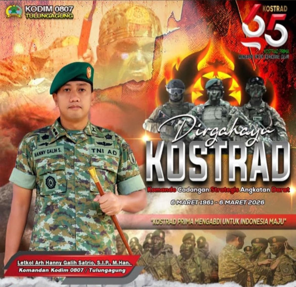 Komandan Kodim 0807/Tulungagung, Letkol Arh Hanny Galih Satrio, S.I.P., M.Han., dalam keterangannya, Jumat (6/3/2026), menyampaikan ucapan selamat ulang tahun kepada seluruh prajurit Kostrad di mana pun bertugas.
