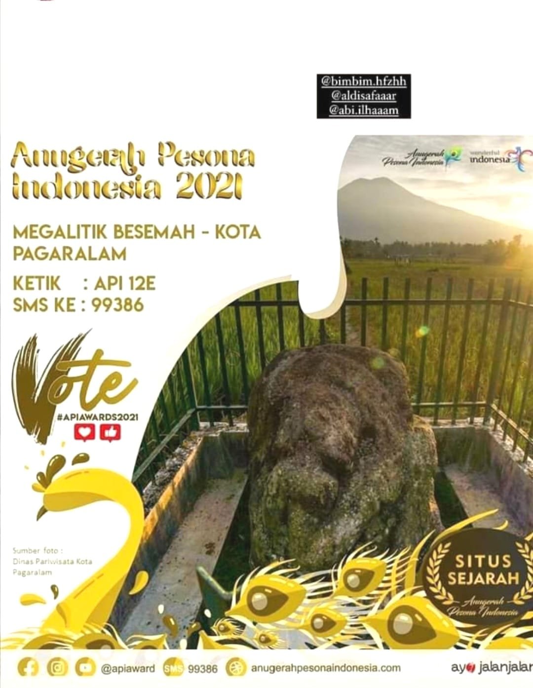 “Apabila Megalit Besemah bisa menang dan dinobatkan sebagai juara pada ajang API Award 2021, tentu akan membuat Kota Pagar Alam akan lebih dikenal secara nasional dan akan mengundang banyak kunjungan wisatawan ke Kota Pagar Alam terutama ke situs-situs megalit,” pungkasnya.