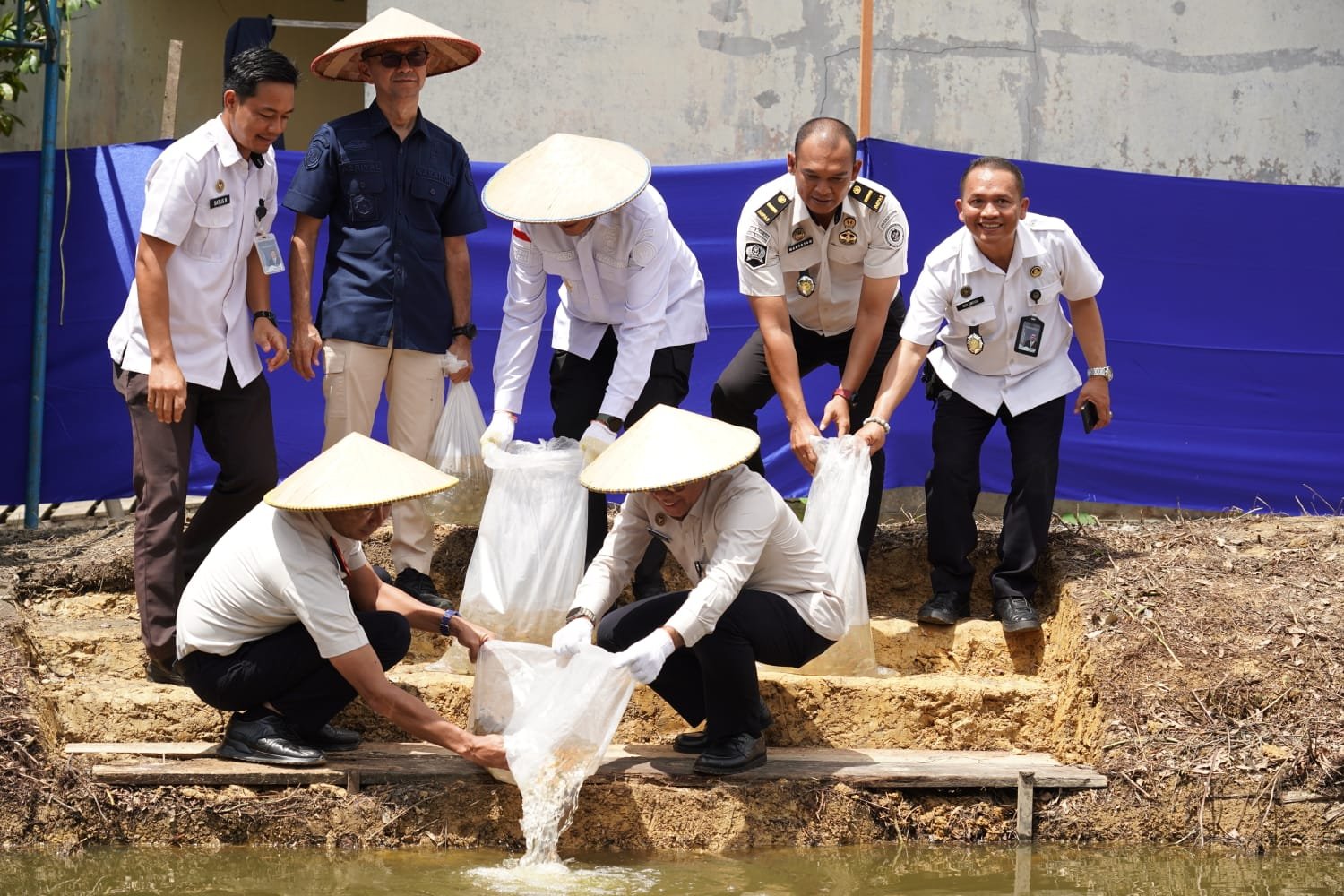 Kegiatan dimulai dengan pelepasan ribuan benih ikan ke kolam yang telah disiapkan, disusul penanaman puluhan bibit tanaman produktif dari buah hingga pohon pelindung di sisi lahan rutan.