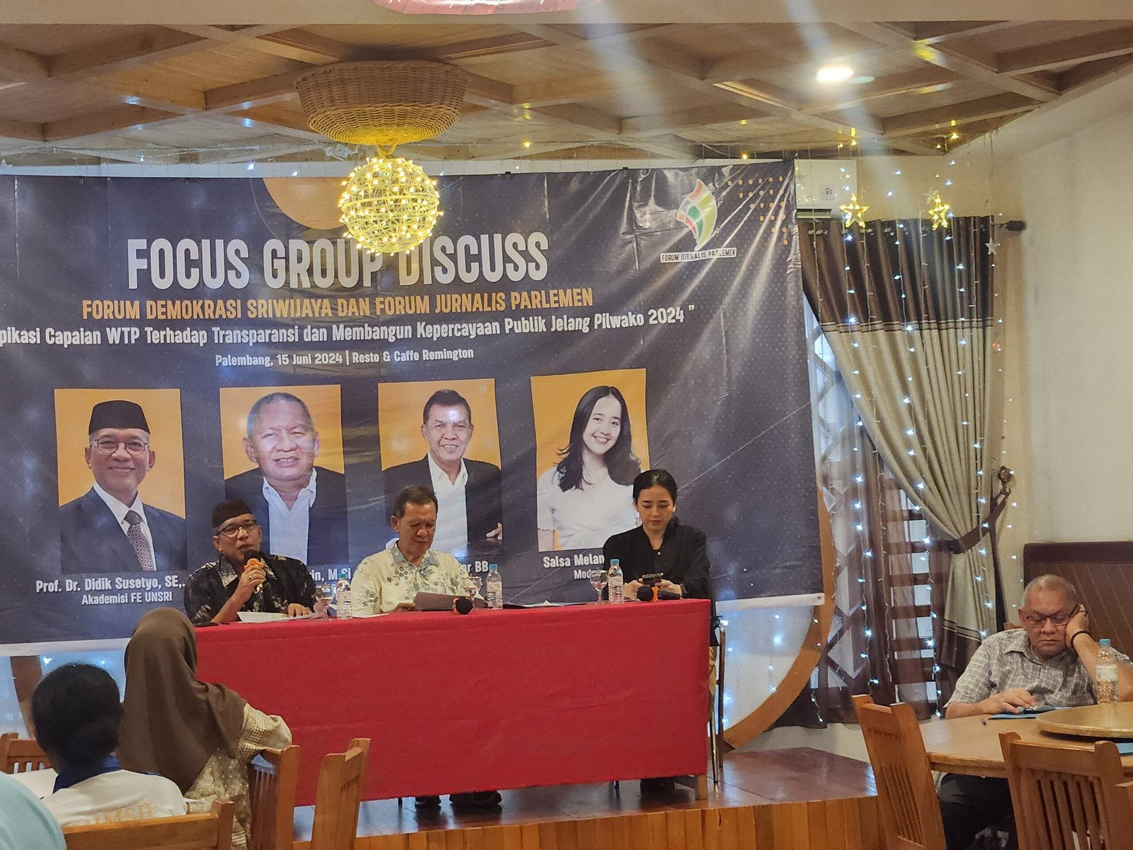 MATTANEWS.CO, PALEMBANG – Forum Demokrasi Sriwijaya (ForDes) dan Forum Jurnalis Parlemen (FJP) menggelar Focus Group Discussion (FGD) dengan tema “Implikasi Capaian WTP Terhadap Transparansi dan Membangun Kepercayaan Publik Jelang Pemilihan Kepala Daerah” di Cafe Remington pada Sabtu (15/6/2024).
