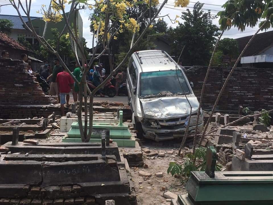 Bukan itu saja, mobil tersebut sampai masuk didalam area kuburan. Anehnya mobil tersebut bodi depan dalam keadaan posisi lurus menghadap ke Timur setelah menyasak tembok.