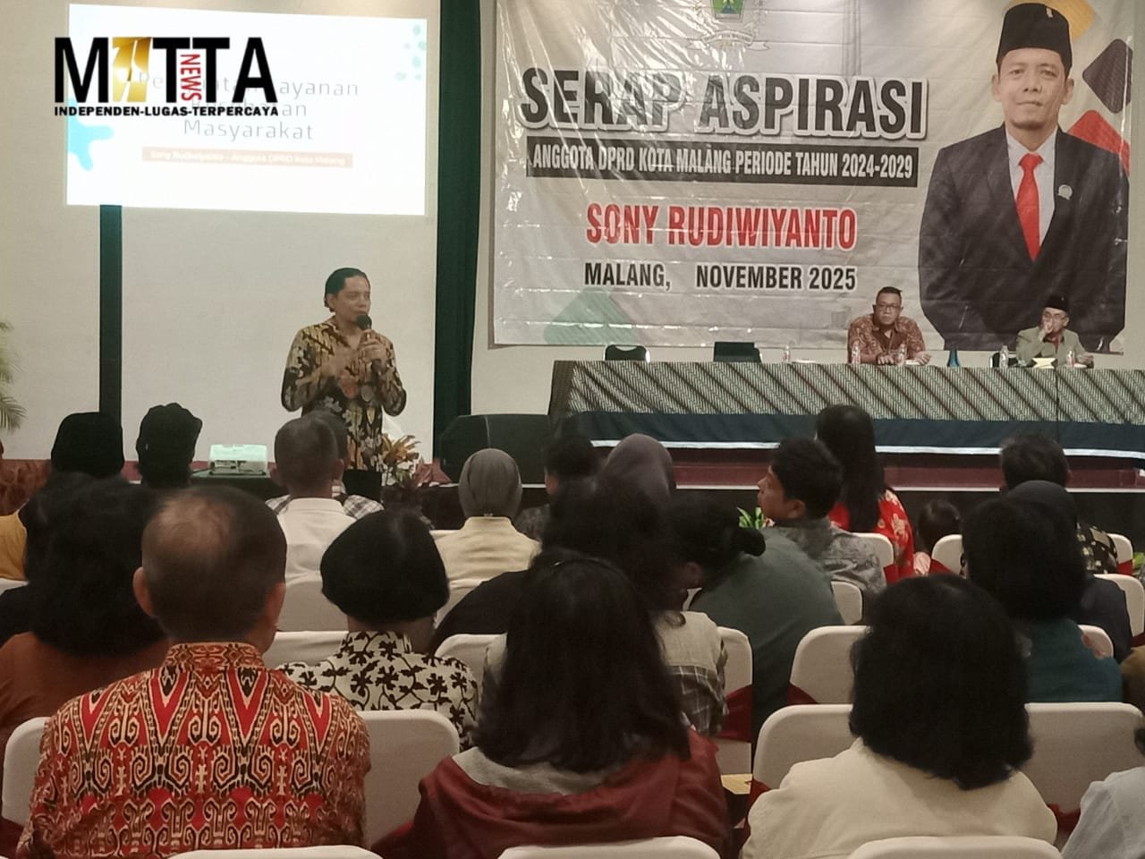 MATTANEWS.CO, MALANG – Serap Aspirasi masyarakat Klojen, Anggota Komisi C DPRD Kota Malang, Sony Rudywiyanto menggelar reses yang ke-4 kalinya di Gedung Widya Bakti, Jum’at (14/11/2025) malam.