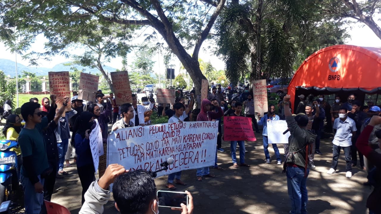 Olehnya itu, pihaknya dari aliansi peduli petugas karantina Covid-19 ingin menyampaikan tuntutan. “Transparansi skema penyaluran anggaran dana Covid-19. Segera bayarkan insentif petugas karantina Covid-19,” pungkasnya.
