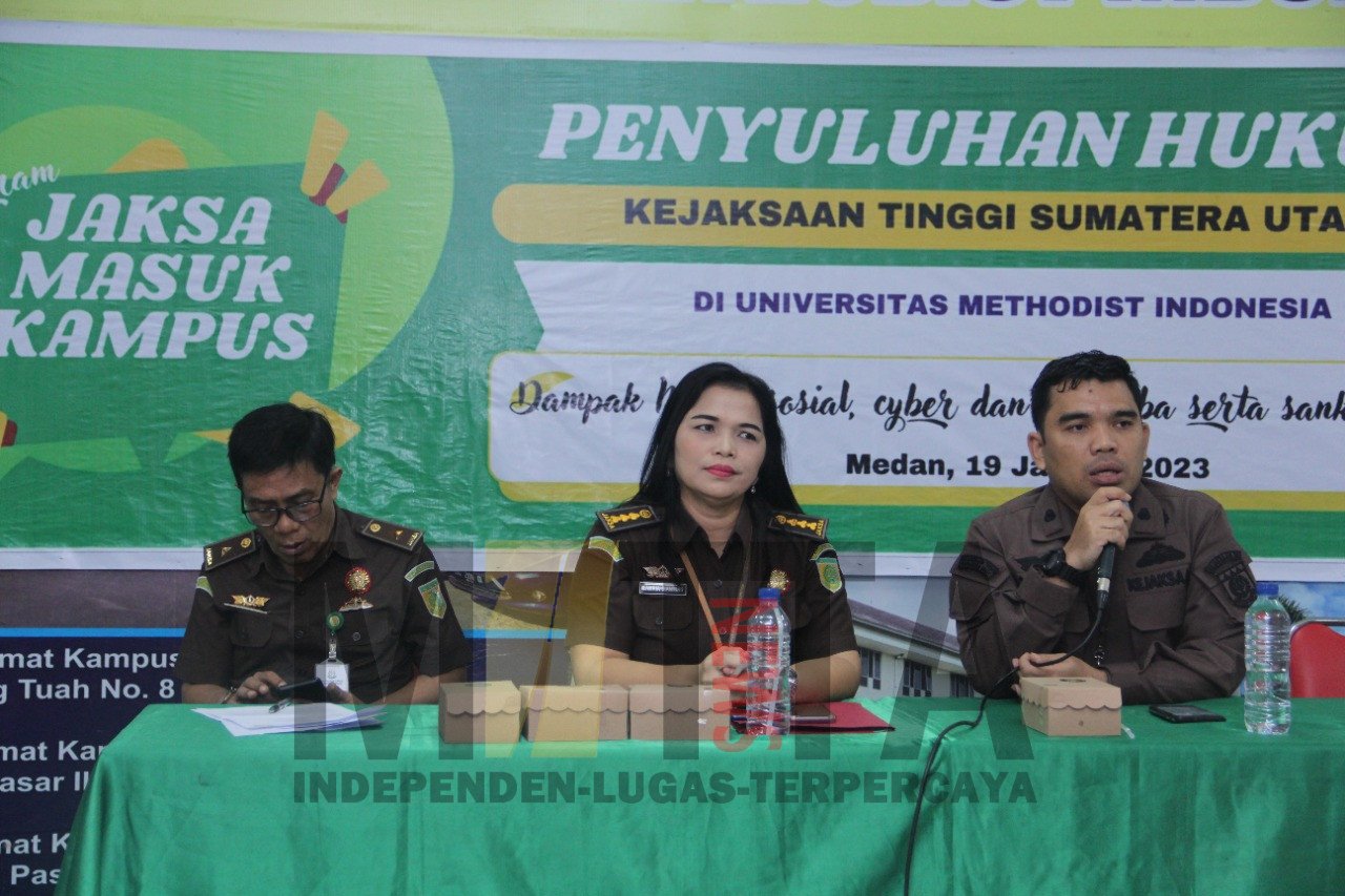 MATTANEWS.CO, MEDAN – Kejaksaan Tinggi Sumatera (Kejati Sumut) melalui Bidang Penerangan Hukum pada Asisten Intelijen Kejati Sumut menggelar kegiatan Penyuluhan Hukum dalam program Jaksa Masuk Kampus di aula Universitas Methodist Indonesia (UMI) Medan Jalan Hang Tuah Medan, Kamis (19/1/2023).