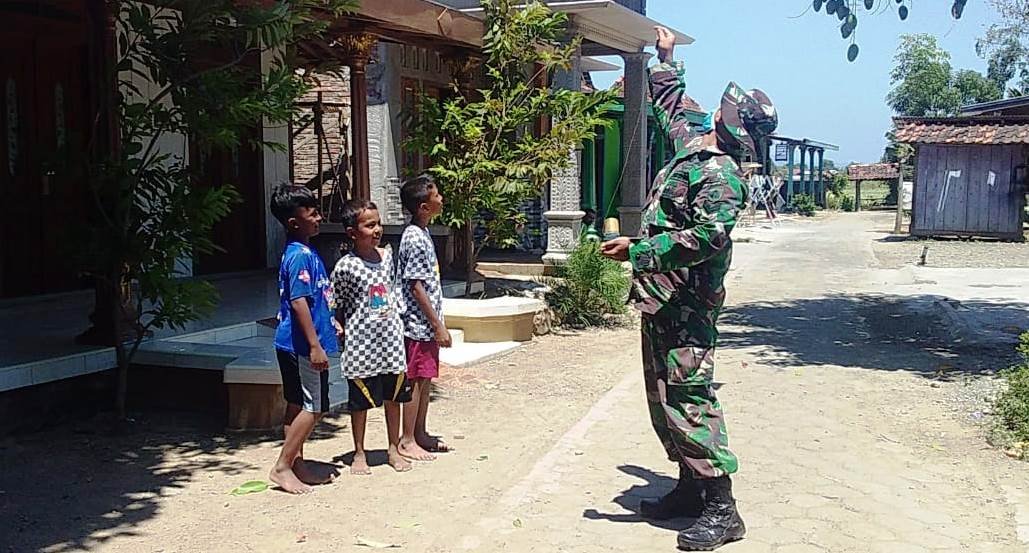 “Adik adik jangan lupa ya tetap pakai masker, cuci tangan, jaga jarak dan jangan lupa sholat,” imbau Serda Rosi. (Pendim 0715/Kendal)