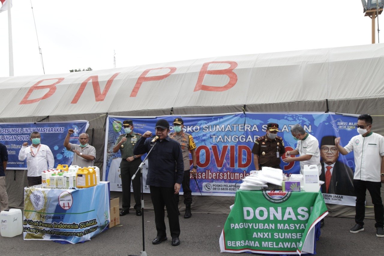 Kali ini, Pemprov Sumsel kembali menerima bantuan sedikitnya puluhan liter biang disinfektan yang jika dicampur dengan air dapat menjadi 100 ribu liter dari Asosiasi Obat Hewan Indonesia (Asohi) Sumsel yang bekerjasama Asosiasi Masyarakat Perunggasan Sumsel dan 1700 set APD dari Paguyuban Masyarakat Anxi Sumsel, Rabu (01/04/2020).
