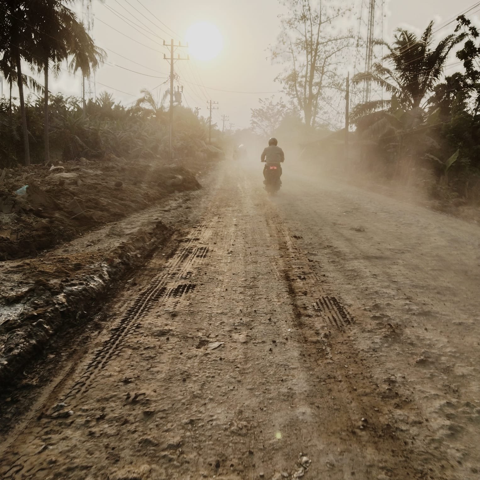 Debu yang begitu tebal dijalanan di akibatkan endimen lumpur yang kering di jalan, apalagi cuaca setiap harinya panas. Membuat kendaraan yang melintasi jalan menaikan debu yang tebal. Ditambah kendaraan besar (roda empat) atau lebih yang melaju dengan kecepatan tinggi sehingga pandangan lalu lintas pengendara terbatas.