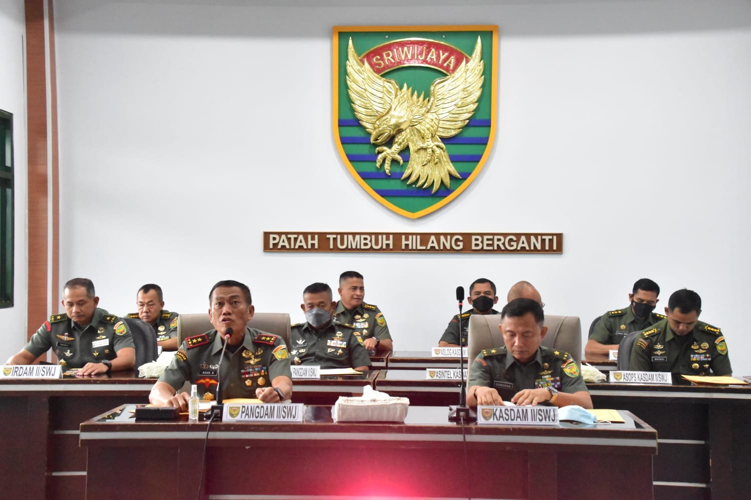 MATTANEWS.CO, PALEMBANG – Guna membahas kesiapan Satuan jajarannya, dalam rangka mengantisipasi perkembangan situasi (bangsit) menjelang Hari Raya Idul Fitri 1443 H/2022 M, Pangdam II/Mayjen TNI Agus Suhardi, memimpin rapat melalui Video Conference (Vicon) dengan seluruh Komandan Satuan (Dansat) jajarannya, di Ruang Audiensi Pangdam Gedung C Lantai – 4 Makodam II/Swj Jln. Jenderal Sudirman KM 2,5 Palembang, Rabu (27/4/2022).