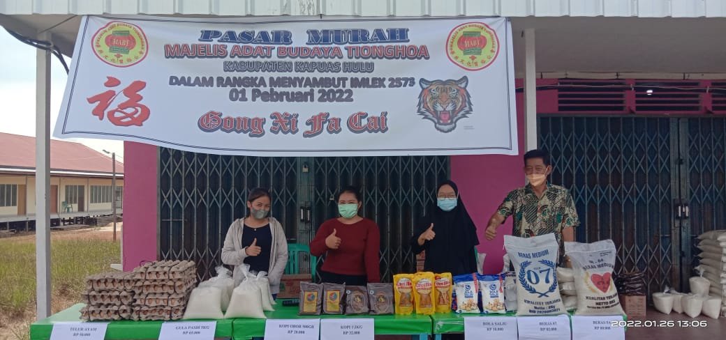 MATTANEWS.CO, KAPUAS HULU –Dalam rangka menyambut perayaan Imlek 2573, pada 1 Febuari 2022 mendatang, Majelis Adat Budaya Tionghoa (MABT) Kabupaten Kapuas Hulu, gelar pasar murah, bertempat di Toko Pelangi, Jalan Lintas Selatan, Kelurahan Kedamin Hulu, Kecamatan Putussibau Selatan, Kapuas Hulu, Kalimantan Barat (Kalbar).