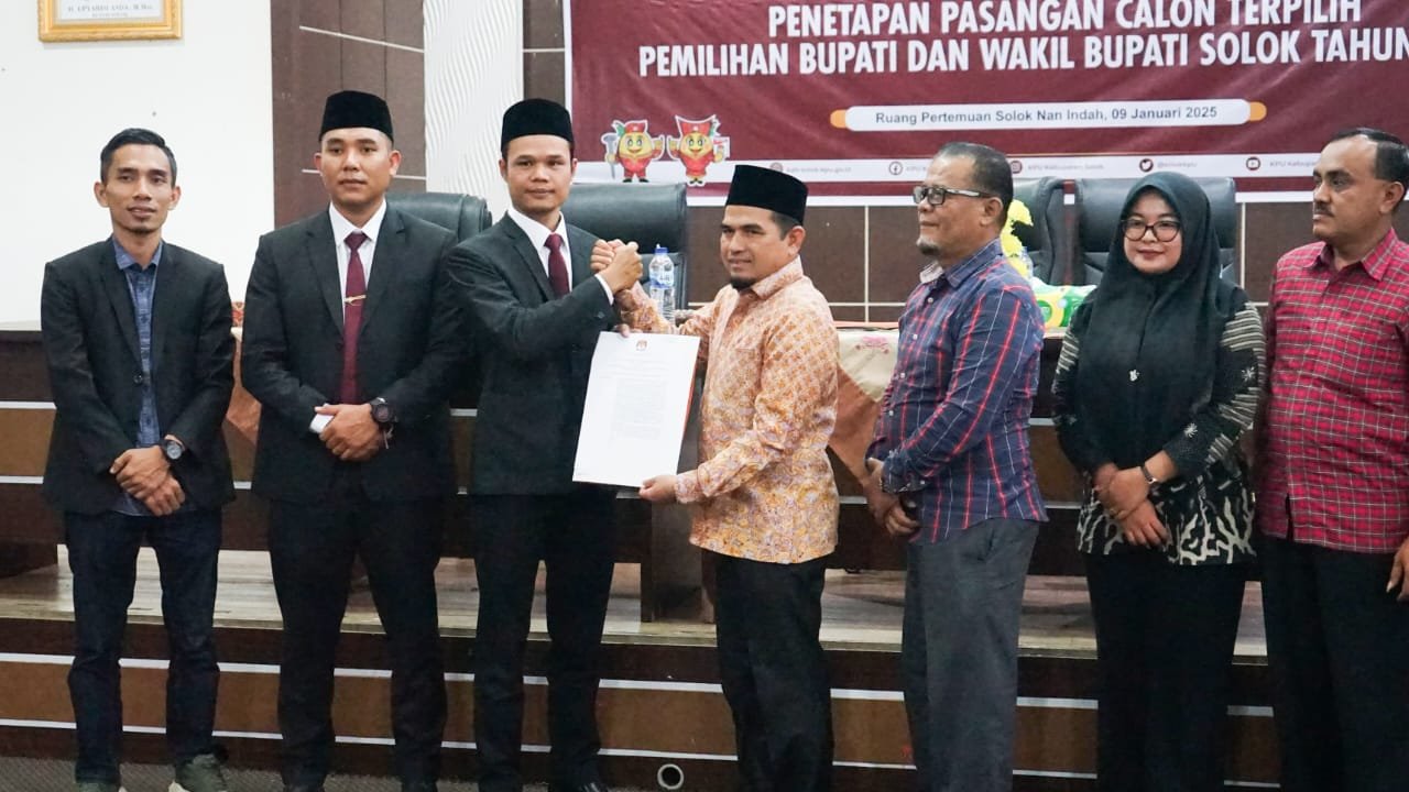 MATTANEWS.CO, SOLOK – Komisi Pemilihan Umum (KPU) Kabupaten Solok menggelar Rapat Pleno Terbuka Penetapan Pasangan Calon Terpilih Pemilihan Bupati dan Wakil Bupati Solok Tahun 2024 di Ruang Solok Nan Indah, Arosuka.