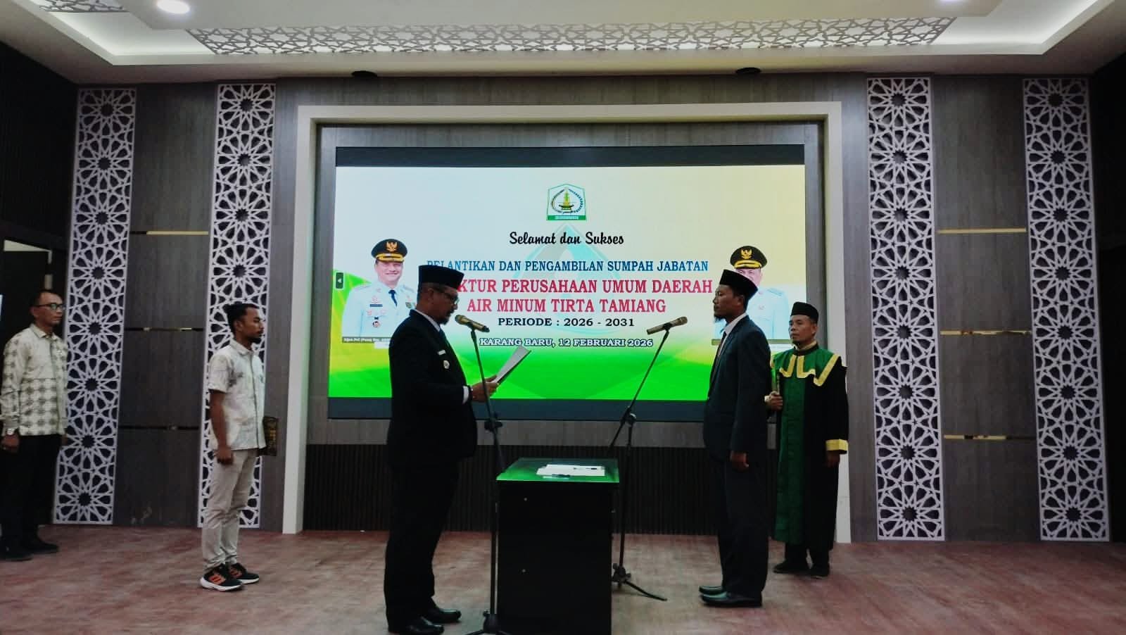 MATTANEWS.CO, ACEH TAMIANG- Direktur Perusahaan Umum Daerah (Perumda) Air Minum Tirta Tamiang periode 2026-2031 resmi dilantik. Pelantikan dan pengambilan sumpah jabatan dilakukan langsung Bupati Aceh Tamiang, Armia Pahmi, kepada Juanda, S.IP di Aula Setdakab, Kamis, (12/2/2026).