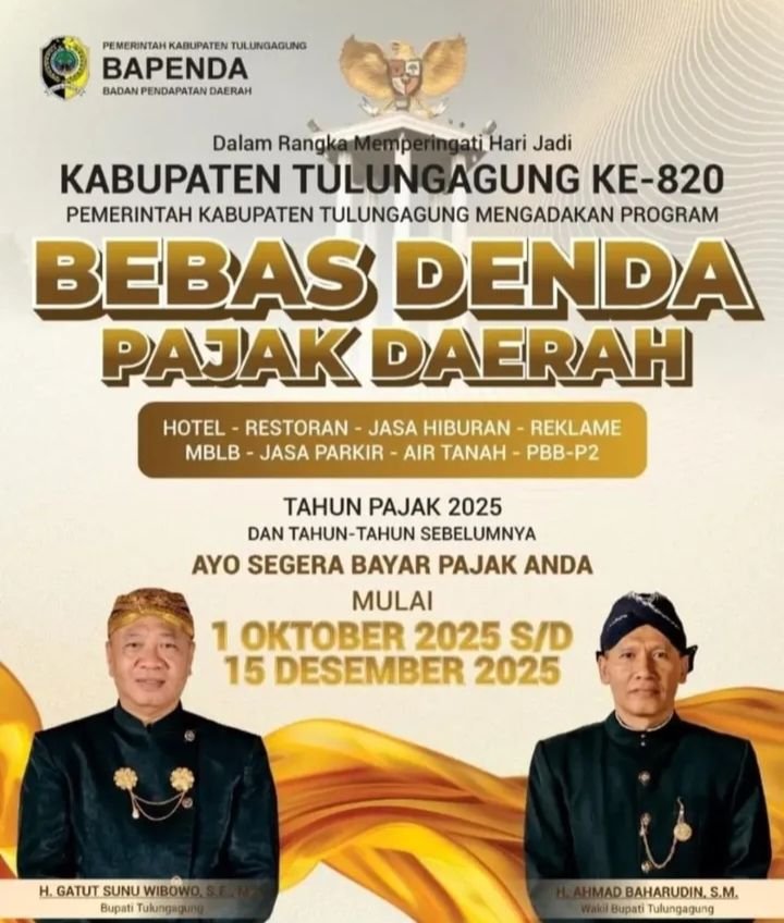 MATTANEWS.CO,TULUNGAGUNG- Kabar gembira datang bagi masyarakat Tulungagung. Dalam rangka memperingati Hari Jadi Kabupaten Tulungagung ke-820, Pemerintah Kabupaten Tulungagung melalui Badan Pendapatan Daerah (Bapenda) resmi meluncurkan program bebas denda pajak daerah. Program ini berlaku mulai 1 Oktober hingga 15 Desember 2025.