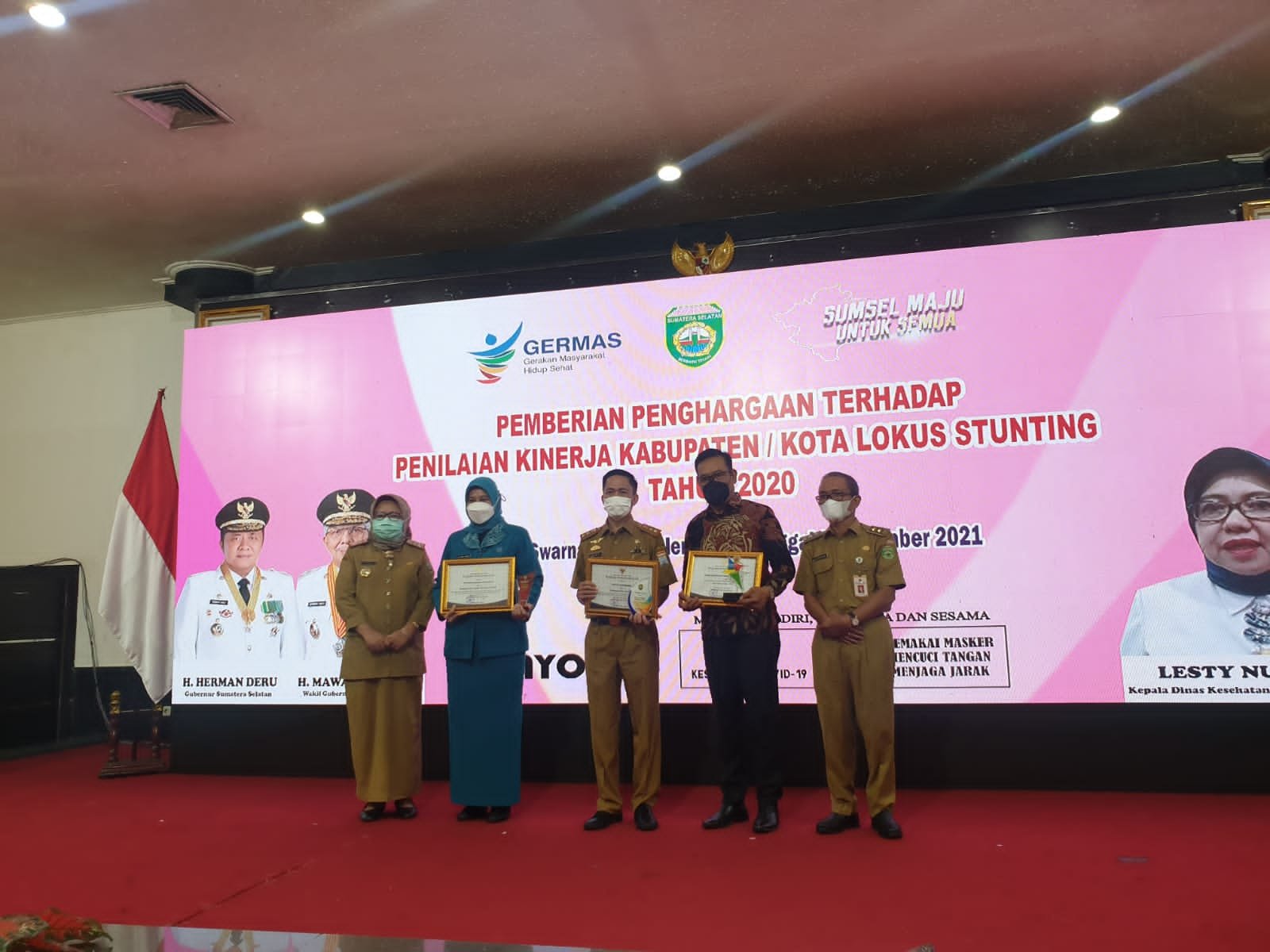 MATTANEWS.CO, LAHAT – Pemerintah Kabupaten (Pemkab) Lahat menerima 2 (dua) piagam penghargaan sekaligus dari penilaian kinerja kabupaten/kota Lokus Stunting tahun 2020 dari Pemerintah Provinsi (Pemprov) Sumatera Selatan. Kegiatan pemberian penghargaan dilangsungkan di Hotel Swarna Dwipa Palembang. Selasa 9/11/2021).
