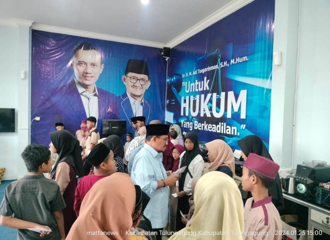 MATTANEWS.CO, TULUNGAGUNG – Calon Anggota Legislatif (Caleg) DPR RI dari Partai Demokrat, Daerah Pemilihan (Dapil) Jawa Timur VI, nomor urut 2, Dr. H. M. Adi Toegarisman, S.H., M.Hum., mengadakan bakti sosial dengan menyantuni puluhan anak yatim pada Kamis (25/1/2024) sore.